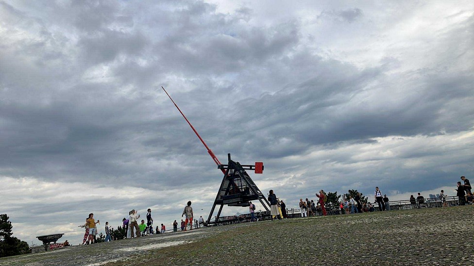 July’s performance took place across four different locations in the center of Prague. The event began late afternoon with a performative introduction in the Ceremony Hall of the Rudolfinum, before moving outdoors to the site of the former Stalin Monument at Letná, beneath the Metronome (this is the part I attended). About two hours later, the action shifted again to the Marian Column on the Old Town Square, before concluding back in the Rudolfinum Ceremony Hall early evening with a closing sequence. The performers, Jiří N. Jelínek, Radim Klassa, Prokop Košař, Jana Kozubková, Soňa Linhartová, Valentina Mara, Johanka Shmidmajerová, Mária Ševčíková, Barča Šošolíková, Bea Stevens, Alessandra Točoňová and Lukáš Zahy, with musical cooperation by Petra Torkošová, formed a multifaceted ensemble moving between spaces, histories and obscure corners of the mind.