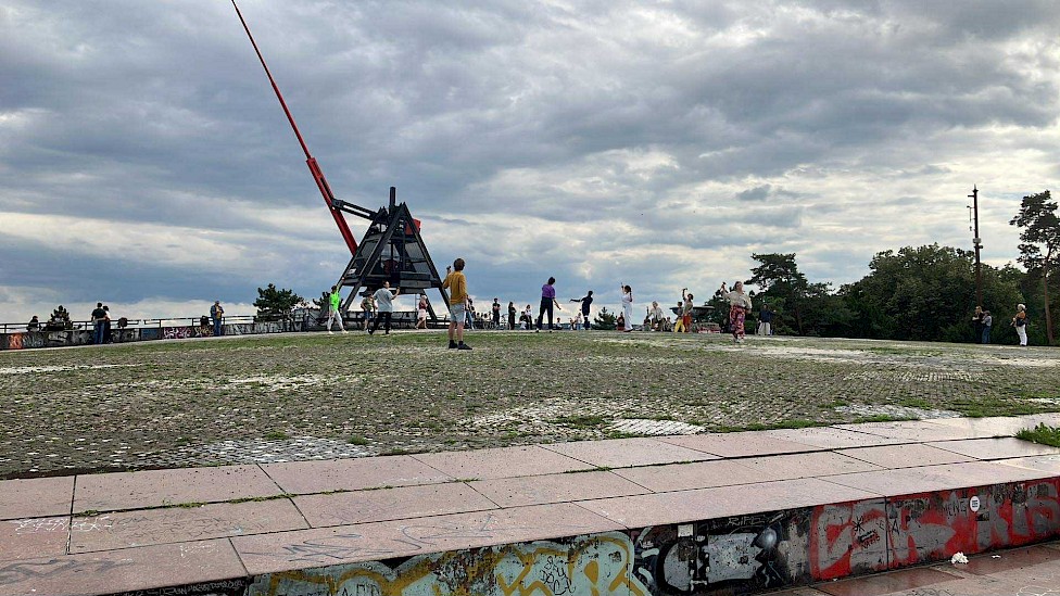 The part I witnessed began beneath the Metronome, in the wide-open expanse where the Stalin Monument once stood. The chosen site already holds something invisible, the ghost of Stalin's gigantic monument and in this way, is marked by absence as much as presence. Viewers gathered loosely around the playing field, with the freedom to move, to come close or retreat, to pass through as if it were another layer of city life. The performers began to move as a collective, their rhythm recalling a flock shifting direction in intuitive, unspoken accord. Each held a sculptor’s mallet and chisel and they struck one tool against the other in a percussive dialogue. While the movements of the performers suggested chiseling away at an enormous slab of invisible stone, the striking of the tools generated a tinkery, crystallic soundscape. Sequences of rhythmic hammering were followed by sudden stillness. In those freezes, silence fell sharply, so total that it carried weight. Then, without apparent signal or immediately detectable pattern, one performer would start again, and the group would pick up the thread, sound and movement rushing back in.