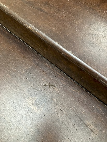 Then something else caught my eye. When the performers stopped in silence, I noticed a group of flies tracing spirals just in front of my bench. Their movements echoed the performers uncannily, tiny versions of the same choreography. For a radiant instant, it seemed obvious that they too were part of the performance, an invisible miniature troupe staging their own dance. Of course the thought dissolved quickly, replaced by reason, but the impression lingered. Later, in the Rudolfinum, I encountered a giant mosquito resting on the wooden steps between Argote’s exhibition rooms, and again I felt that continuity, that the insect world had been following me, stubbornly inscribing itself into both performance and exhibition. What does it mean for our perception when the choreography of flies can momentarily merge with human art-making?