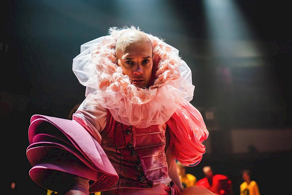 Kostýmy a těla, která je nesou po pohyblivé kruhové točně, splývají v jeden celek a působí jako dechberoucí pohyblivé sochy. Expresivní prvky prostorově výrazných kostýmů objímají své nositele (jako například mohutný límec na kostýmu Rostislava Nováka, ve kterém se jeho hlava skoro ztrácí) a zároveň jim nepřisuzují žádnou jednoznačnou identitu. Jsou genderově neutrální, žádný z kostýmů není „mužský“ nebo „ženský“. Muži mají sukně, ženy uniformy toreadorů a hranice mezi pohlavími se stírají. Kostýmy tak přímo na tělech herců a hereček ukazují to, o co inscenace usiluje: vymanění se ze společenských škatulek. Stejně genderově neutrálně jsou oblečené i „nesourodé tlupy děcek“, jak je nazval sám Viktor Tauš. Žluté mikiny s nulou doplněné krátkou tylovou sukní, které má většina mladých herců a hereček, neukazují jen společný výchozí bod, ze kterého začínáme všichni, ale i to, že jsme si všichni v základech rovni.