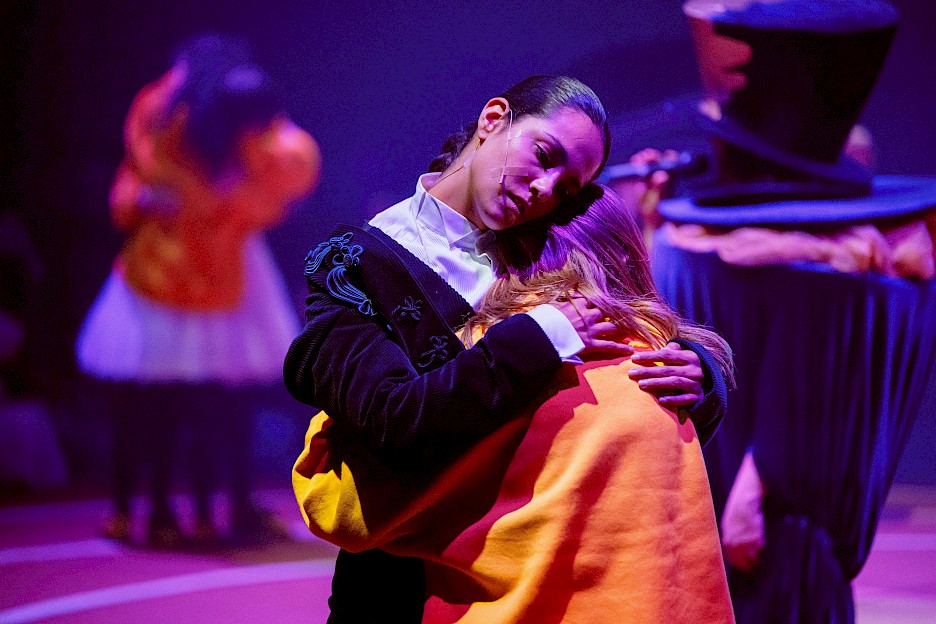 Kruhová, neúnavně se otáčející, hypnotická točna nebyla jen praktickým prvkem scény, ale také srdcem celého rituálu. Herci a herečky se otáčeli spolu s ní a hranice mezi jednotlivými těly se postupně rozplývaly. Repetitivní pohyb působil až hypnoticky uvolňujícím dojmem, jako by vybízel k tomu něco uvolnit, opustit, stát se někým jiným. Pokaždé, když na scéně proběhl boj, ať už boxerský zápas, rapový battle, krump nebo fyzický střet mezi herectvem, přišlo nakonec jejich vzájemné objetí. Jako by ti, kteří se na inscenaci podíleli, ventilovali, křičeli, dostali ze sebe vše, co je dusí, a pak nás objali. Znovu a znovu.