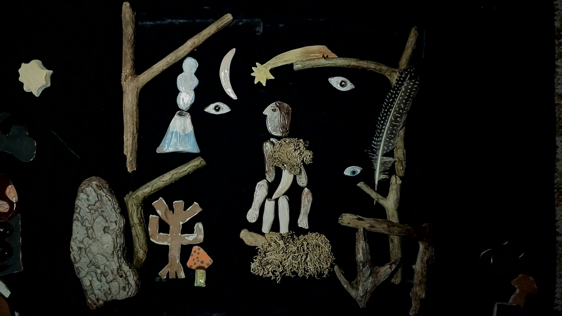 Kromě konkrétní války se tak inscenace zaobírá i bojem, který vede každý ve svém nitru, a citlivě poukazuje na bolest, s níž se mohou potýkat lidé s jakoukoliv formou traumatu. Život a vyrovnávání se se zraněním pak tvůrčí tým demonstruje za pomoci manipulace s hlínou. V průběhu představení totiž sledujeme postupnou a pomalou tvorbu keramických tvarů, která odkazuje na náročný a dlouhý proces hojení, k jehož završení musíme vynaložit spoustu úsilí a někdy také zapojit více lidí. Bílíková sedící na levé straně jeviště průběžně vytváří z šedivé hmoty malé misky a zároveň příležitostně recituje básně a předčítá dopisy. Misky pak odnáší na protilehlou stranu jeviště Kulikov. Zapichuje do nich kabely a díky tomu spolu s publikem zkoumá jejich neslyšitelný zvuk. Nebo možná misky díky elektrickým drátům, které by mohly sloužit jako zdroj tepla, přetváří v keramiku? Finální fázi procesu s hlínou pak dokončuje Gumboldt-Romanova. Z jednoduchých keramických tvarů vytváří na černé podložce výjevy, jež korespondují s průvodním slovem. Tato činnost může zrcadlit zmíněnou depresi, jež dokáže člověka „rozložit na kousky“ navzdory tomu, že k sobě všechny díly zdánlivě pasují a působí navenek kompatibilně a zcela v pořádku. (Jsem zdravá, mám kde bydlet a co jíst, mám dobrou práci a rodinu, tak proč je mi špatně?) Pro tvorbu obrazů využívá performerka i další, převážně lesní, předměty (kůru, mech, pírko, šišku) a její práci můžeme sledovat díky principu live cinema, které dění přenáší na plátno umístěné v zadní části jeviště.