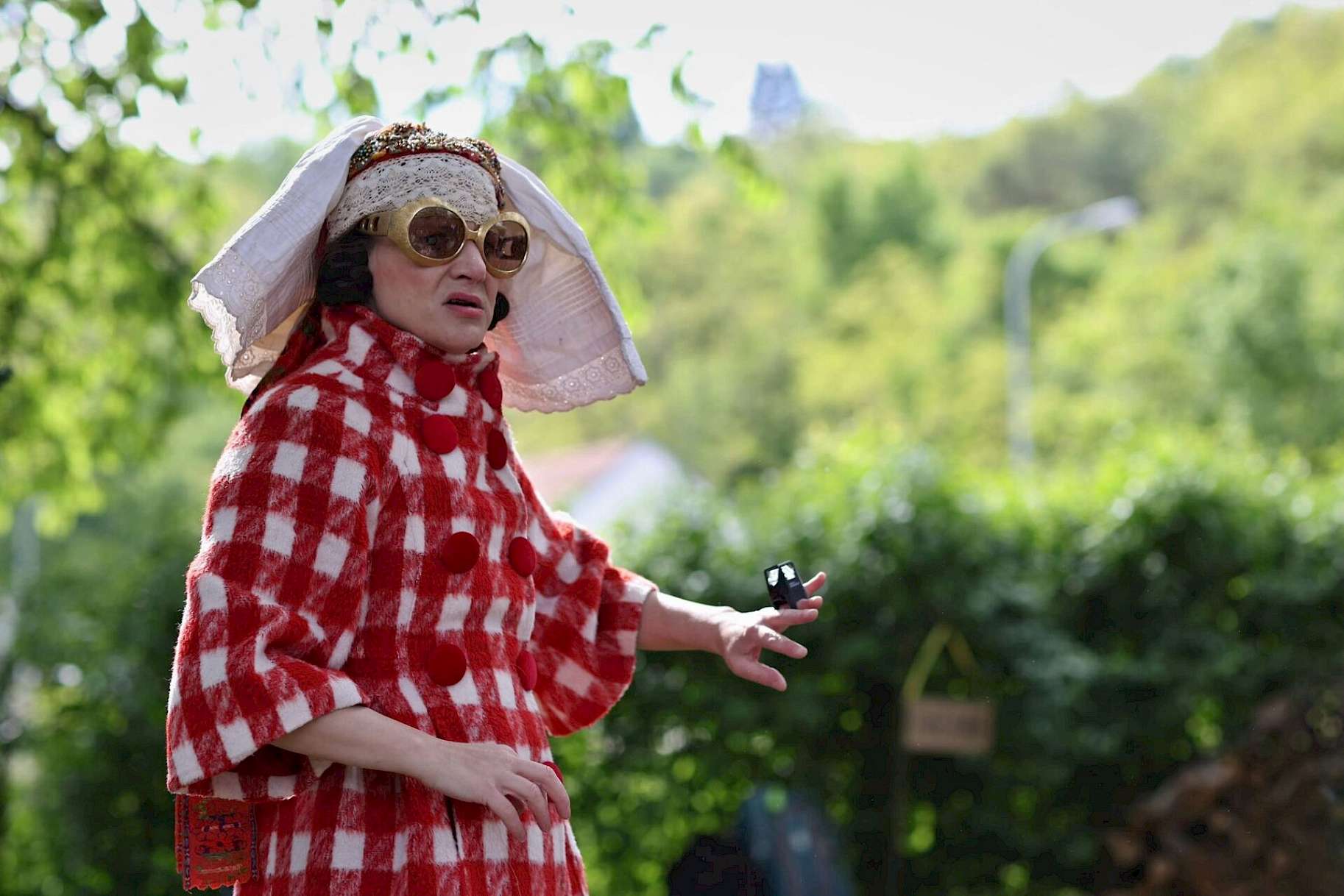 Energická Pola vbíhá na jeviště v červeném overalu a kostkovaném kabátku a skrze krátké epizodky nás uvede do světa pohádek řízeného vypravěčem – cyklistickým světlem na hereččiných prstech. Baterka se rozsvítí pokaždé, když protagonistka svým bezstarostným povídáním uteče z děje. Po červeném zablikání se ale poslušně vrátí k původnímu příběhu. Po tomto zábavném úvodu se naplno rozběhne ústřední one woman show, během níž Pola zastane všechny postavy z pohádky o Červené Karkulce: malá marioneta představuje holčičku, vařečka se zástěrou maminku a velké Gucci brýle nahrazují babičku.