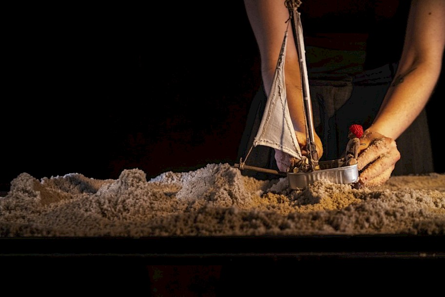 Kromě zezadu manipulované drobné loutky ústřední postavy sehrál v představení zásadní roli písek. Se sypkým materiálem zacházela zejména Novotná s rozvážnou citlivostí a opakující se dynamikou. Zdůraznila ji například překvapivě dlouhá, ale velmi precizní scéna, v níž se muž na loďce vydal na pravidelnou vyjížďku po moři (tato část se odehrála na začátku, tedy ještě před vytvořením zmiňovaného vodního prostoru). Loutkoherečka přesouvala z jedné vlny na druhou plechovku s oplachtěným stožárem, již kormidloval na zádi sedící námořník. Každou z vln nejprve sama vytvořila, takže než plavidlo „přeplulo“ celý stůl, muselo postupně překonat několik takto vzniklých kopečků-vln. Pomalejší a rozvážné tempo bylo v inscenaci využíváno opakovaně.
