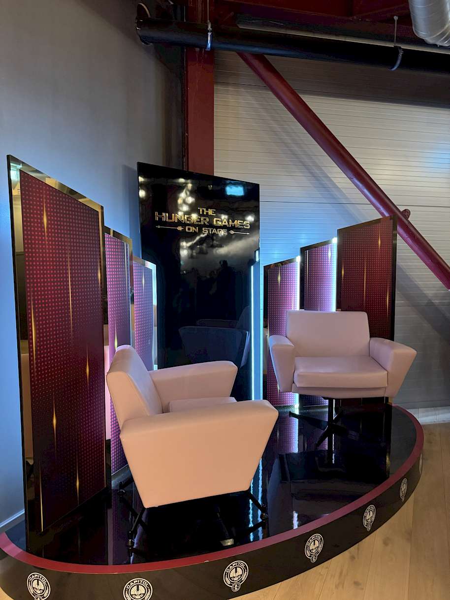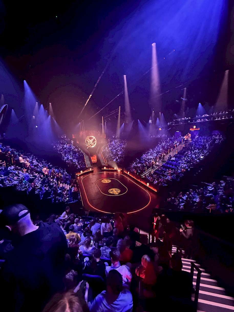 V moderním srdci Londýna bylo letos postaveno Troubadour Canary Wharf Theatre speciálně pro jevištní zpracování Hladových her. Megalomanská železná konstrukce se sedadly pro 1200 lidí se pyšní přímo kapitolskými technologiemi: pohyblivými sedačkami, skutečnými plameny, levitujícími stožáry, obrovskými LED obrazovkami, létajícími zbraněmi a blikajícími kostýmy. Kapitolské je i rozdělení a ceny míst: dvanáct částí (potažmo krajů) obklopuje oválnou arénu, z čehož jsou první a druhá pohyblivé. Směrem do stran se tak v jistých chvílích tvar stage mění. Uprostřed ní se nachází jedna hlavní a čtyři vedlejší vyjížděcí plošiny, které simulují vlakové kupé, pódium televizní talkshow nebo roh hojnosti. Dojem hrůzy z arény smrti se povedl přenést i do divadelního ztvárnění. Kostýmy naopak mohly přitvrdit, protože oděvy mírotvorců působí jako halloweenská variace postav ze seriálu Squid Game.