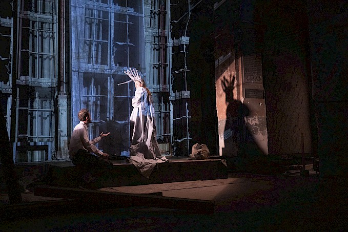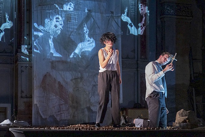 Dějové zjednodušení však skrze komplexní pojetí svých postav výborně kompenzují výkony Václava Marholda a Dany Markové. Role Konstantina Wilemanna se zdá jako ušitá na míru pro Marholda, protože zde může pracovat se svým civilním projevem, do něhož mísí tragédský výraz. Konstantin Wilemann v jeho podání působí uvěřitelně, lidsky a srozumitelně. Herec ukazuje jeho zranitelnost, perfektně pracuje s pohybem i intenzitou hlasu, takže doslova víří prostorem. Marhold v rámci myšlenek umí užít pauzu pro nadechnutí a doznění významu, což stejně tak ovládá i Dana Marková. Ta se na rozdíl od svého kolegy nedrží jedné polohy, ale střídá jich hned několik, což je podtrženo i výpravou. Její Hela v obrovském světlém kostýmu stylizovaném do madony působí nepřístupně a odtažitě. Pracuje s úspornými gesty a pohybem, což pak záměrně kontrastuje s jejím energickým ztvárněním prostitutky Salome v paruce s dlouhými zrzavými vlasy, v černém korzetu a punčochách. V roli Konstantinovy matky ve velkém saku coby bílá polská orlice pracuje s patetickým projevem, jenž výborně vystihuje naturel postavy i princip rádoby vlasteneckých hodnot. V roli Černého anděla – vypravěče je velice expresivní, čímž jde do protipólu s Marholdovou civilností. Jedná se tak o hereckou souhru pod režijním vedením Ewy Zembok, jejíž kvality zvýrazňuje i videomapping Lidye Arinny Emir znázorňující stavy způsobené morfiem, ale také rozklad postavy Konstantina Wilemanna. Ten během představení, ale i v předloze doslova ztrácí vlastní tvář. Například, když se vydává za svého otce Němce, aby mohl vstoupit do protiněmeckého odboje. Videa skvěle konvenují i s prostorem, který různě proměňují, třeba na válkou zničenou Varšavu nebo složitou Konstantinovu mysl. Live cinema ani video art nejsou v současném divadle nic neobvyklého, zde se však jedná o pozoruhodný estetický zážitek, který má svůj význam i funkci.