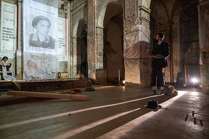 Na jednom ze sloupů visela časová osa samotné předlohy znázorňující období od jejího vydání, ocenění odbornou i širokou veřejností až po uvedení Rekulturem, na jiném zase historie polské orlice či polského státu. Mezi tím vším zdi zdobily verše Rafała Wojaczka, polského básníka, narozeného několik měsíců po konci druhé světové války, a Tadeusze Stefana Gajcy, básníka a vojáka pocházejícího z Varšavy, jenž se narodil v roce 1922. Jejich texty překypovaly erotickými, ale také lyrickými motivy s důrazem na zemi či hlínu (prostor rašícího života i mrtvých těl) a vystihovaly tak Konstantinovu náturu. Tato postava se nezabývá ani tak obsahem zde popsaných sloupů, ale soustředí se na svou pudovost a prožitky, které život v kombinaci s užíváním morfia může nabídnout. Nejvíce však na mě zapůsobilo stanoviště s Konstantinovým deníkem, nad nímž stálo: ,,Prozkoumej mě!” jako by nám to našeptával vypravěč z románu. Právě zde se divák mohl seznámit se všemi hlavními postavami knihy, ale také blíže nahlédnout do Konstantinova světa a zjistit, že ačkoli se jedná o otce malého chlapce a manžela, lomcují jím ženy, hlavně prostitutka Salome, kterou rád maluje. Měla jsem pocit, jako bych právě vstoupila do něčího intimního prostoru, třeba koupelny nebo ložnice, kde se daný člověk obnažuje ve vší své zranitelnosti, které má hlavní (anti)hrdina na rozdávání. Dále zde byl na několika místech QR kód, po jehož naskenování se otevřel soubor s názvem Krótka przypadkova historia, která rozšiřuje divákovo povědomí o historii Polska. Nezabývá se jen kontextem začátku války v roce 1939 a děním ve Varšavě, do něhož je situován román, ale záběr studie sahá až ke konci války. ,,Kolik tohle muselo dát jen práce a času?” pomyslela jsem si a obdivně jsem se znova rozhlédla kolem sebe, abych ještě načerpala tuto tajuplnou atmosféru. Je mi jasné, že zejména tento obsah vyšel z iniciativy režisérky Ewy Zembok, pocházející ze slezské části Polska, jehož historii i kulturu výborně zná. Právě zde se jí povedlo z jejích kořenů pro divadlo vytěžit nejvíc a zároveň dala publiku možnost volby, jestli si chce materiál prostudovat, anebo prostě jen tak v synagoze být.