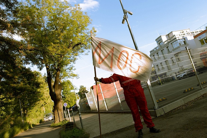 Kino Utajeno, projekt studentstva několika vysokých škol v Praze (FAMU, DAMU, AVU, UMPRUM a FF UK), kombinuje kurátorovaná (a pro diváky do poslední chvíle utajená) filmová promítání se živými vystoupeními na jinak nepřístupných či všeobecně zapomenutých místech. V minulosti díky kolektivu ožily například Olšanské hřbitovy nebo stará čistírna odpadních vod v Bubenči. Na začátku září tvůrčí tým pozval účastnictvo do starého skladového areálu ve Strašnicích, který lze nazvat „nemístem“ – neslouží už totiž svému původnímu účelu. K industriálním budovám vede mezi zelení schovaná cesta přes koleje, po nichž žádné vlaky dlouho nejezdí. Místo cestujících čeká vedle zarostlých kolejnic performerka Alessandra Točoňová s policejní plácačkou, aby příchozí poučila o nutnosti dodržování pravidel práce.