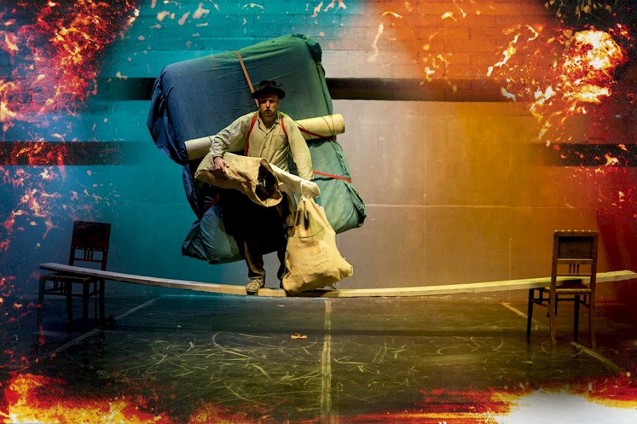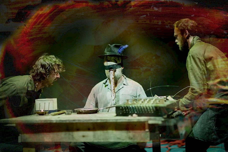 Já jsem z nich cítila až takovou „archaickou“ maskulinitu, což pro mě byl výrazný interpretační rámec. Přispíval k tomu nejen ten zevnějšek, tělo a kostým, ale hlavně klid, který z jeviště šel. Herci skákali na stůl, který si předtím sami složili, zatloukali hřebíky, rozdělávali oheň. A přitom z nich nešla nervozita a tenze, jakou občas pociťuju v hledišti, když se na scéně pracuje s ohněm nebo dělá opravdová manuální práce. Po celou dobu z nich vyzařovala totální vyrovnanost, rozvaha, jako by bylo samozřejmé, že nic neshoří, nic se nezničí, nic nespadne. Skoro bych řekla, že pro mě ztělesňovali takový ten abstraktní prototyp muže, který se, velmi starosvětsky řečeno, postará – naštípe dříví, udělá oheň, uloví oběd, ochrání.